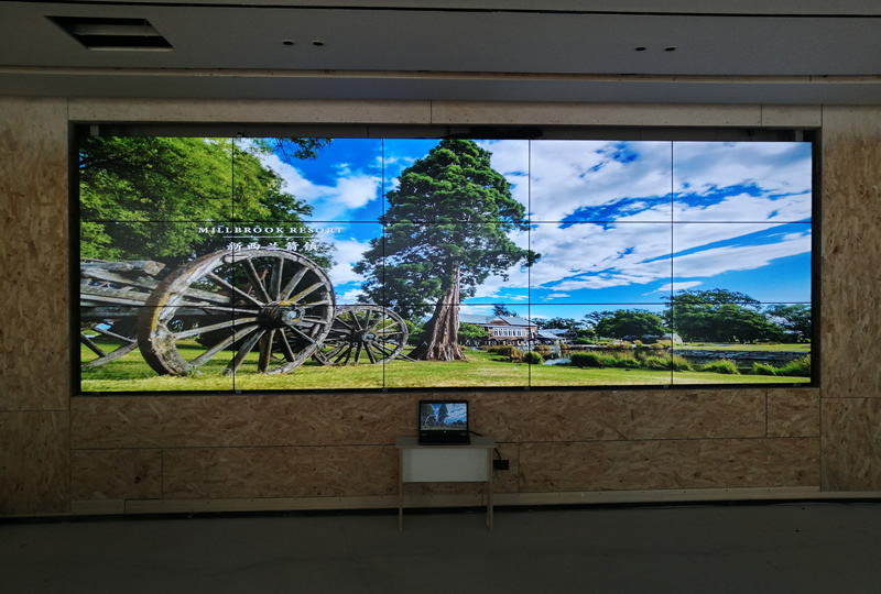 本案例中,維康國(guó)際為威海市金鼎璽悅售樓部提供一套顯示大屏,由3x5拼接、46寸3.5mm液晶拼接屏組成,采用內(nèi)嵌的壁掛式安裝,大屏幕顯示清晰亮麗,如上圖所示。
