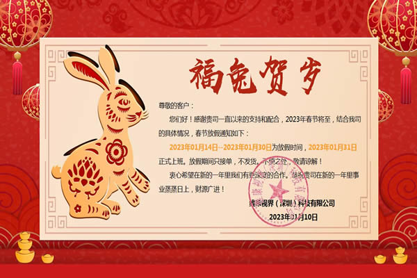 新年將至,預(yù)祝大家新年快樂!感覺大家一直以來的支持與認(rèn)可。根據(jù)相關(guān)規(guī)定,結(jié)合我司經(jīng)營情況,2023年春節(jié)放假公告如下: