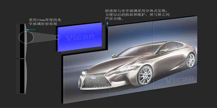 維康自主研發(fā)BFT技術(shù),采用優(yōu)良高分子高透明材料PMMA,利用光線折射原理,解決液晶屏拼接存在的物理黑邊問題,實(shí)現(xiàn)屏幕之間的縫隙消隱,展現(xiàn)出屏幕巨大一體化顯示效果。