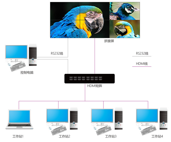 2、傳輸2K高清信號源,支持多臺電腦信號同時上大屏顯示,而且可實現(xiàn)任意切換顯示功能。