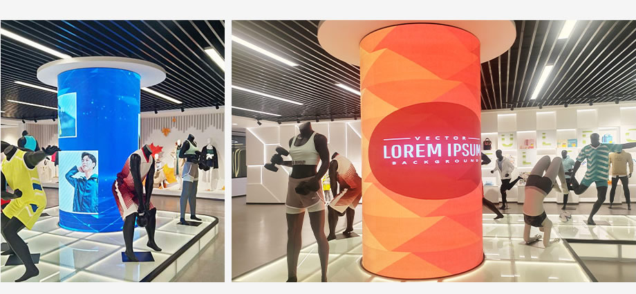 有一些展廳,由于圓柱比較大,所以還可以打造多組LED顯示屏,下圖就是安裝在某集團(tuán)展廳的一組采用P1.86的軟模組組成的圓弧形LED顯示屏效果,整個弧形更加自然。