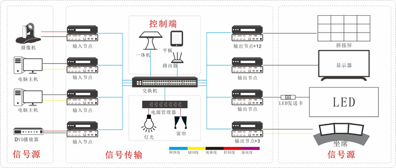 系統(tǒng)將音視頻采集、傳輸、控制和顯示都通過數(shù)字化網(wǎng)絡(luò)連接起來。采用集中式處理、網(wǎng)絡(luò)式控制架構(gòu),同時可以把地理上分散的各節(jié)點(diǎn)統(tǒng)一控制管理起來。并且具備極大地的靈活性和擴(kuò)展性,支持音視頻信號多點(diǎn)共享,移動終端預(yù)覽控制、音視頻網(wǎng)絡(luò)交互式通信等功能。